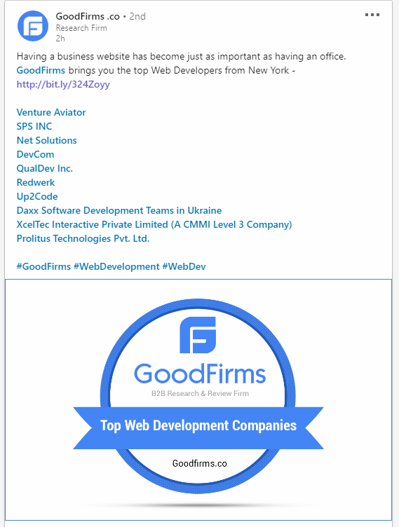 We are excited to announce that XcelTec Interactive Private Limited yet another time has been featured as one of the leading Top Web Development Companies in New York by GoodFirms. GoodFirms is an individualist research-based firm that helps in improving distinct companies’ online status and trustworthiness score through scientific research. However, it aims to help thousands of service seekers in their search for finding a perfect technology or marketing partner that matches their needs.