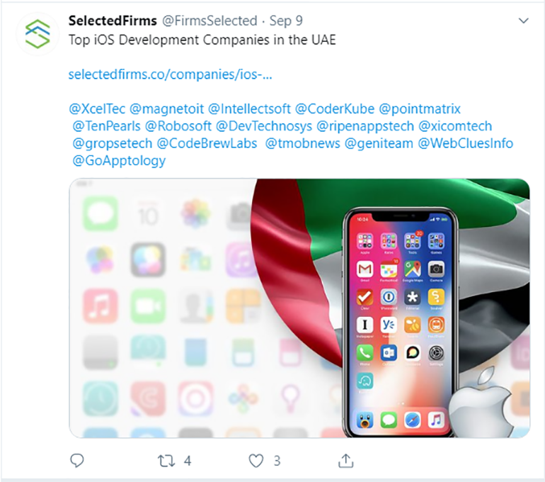 XcelTec Glorifies Among the Top iOS Development Companies in UAE at SelectedFirms. XcelTec is very pleased to have got this recognition of our excellent services and skills from SelectedFirms. SelectedFirms – a research and reviews firm, located in the United States scores companies like us based on our market presence, procedures, and experience, so this help of our solutions and strategies says volumes about our quality performance.