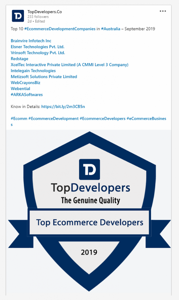 XcelTec is a company having a global presence, with offices in India, USA, UAE, Nigeria, Iran, and Australia. Our global presence has allowed us to understand the tones of the local market and cuisine to clients’ demand in a better manner. In the past 3 years, we have grown into a 50+ employee organization and have served 300+ clients in the process. We would like to thank TopDevelopers.co for their value-free research and analysis which listed our company as a Top eCommerce Development Company in Australia. This gratitude makes us proud and enhances value to our efforts and hard work in the IT industry. XcelTec’s profile on TopDevelopers.co is the right place to know about us in brief. We found the platform a special medium where we can connect with our potential clients easily.